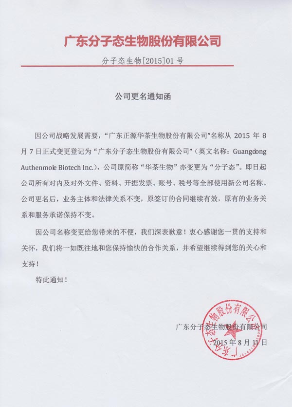 因公司戰(zhàn)略發(fā)展需要, “廣東正源華茶生物股份有限公司”名稱從2015年8月7日正式變更登記為“廣東分子態(tài)生物股份有限公司”。特此通知,詳情請瀏覽圖片內(nèi)容。